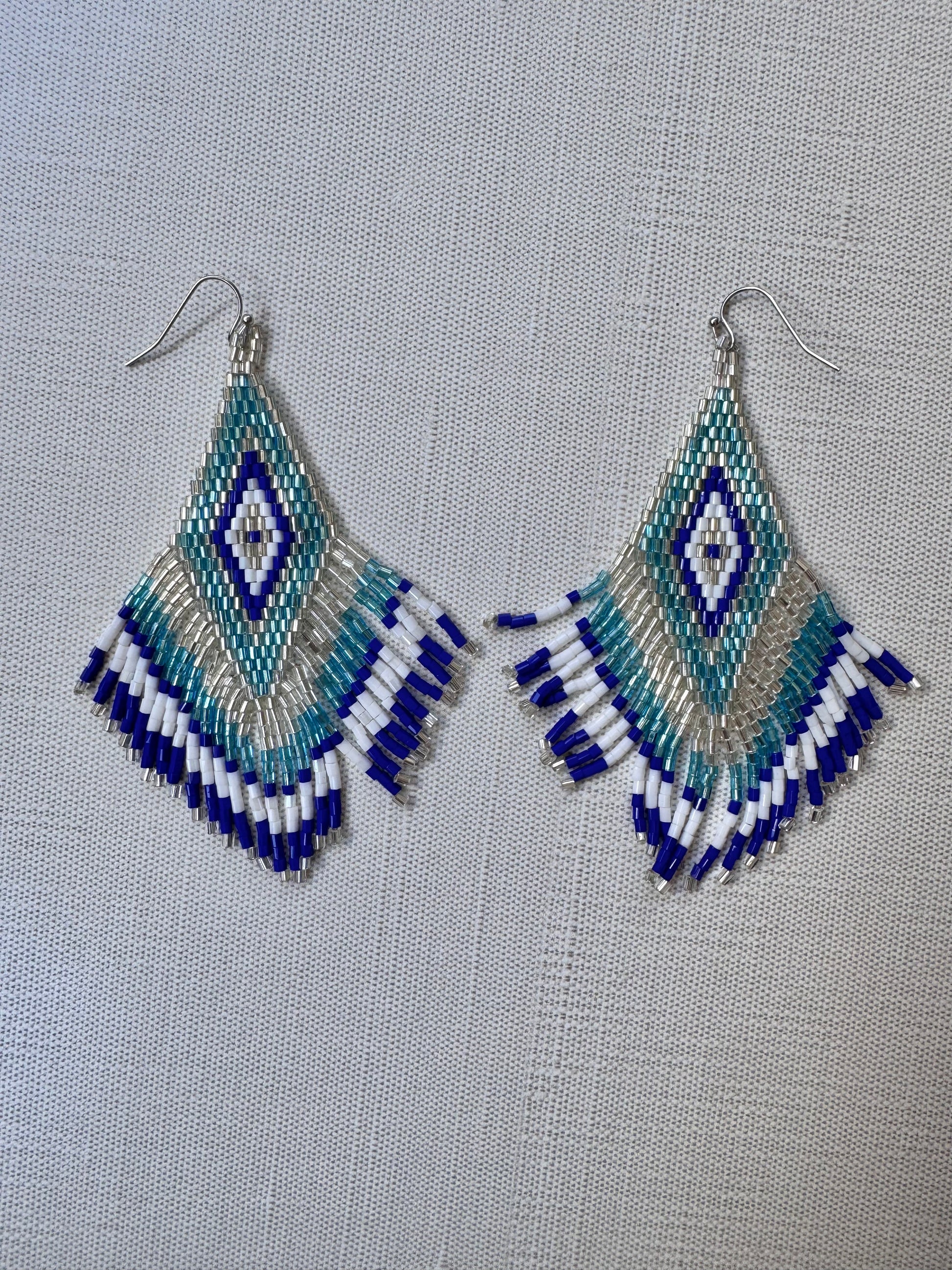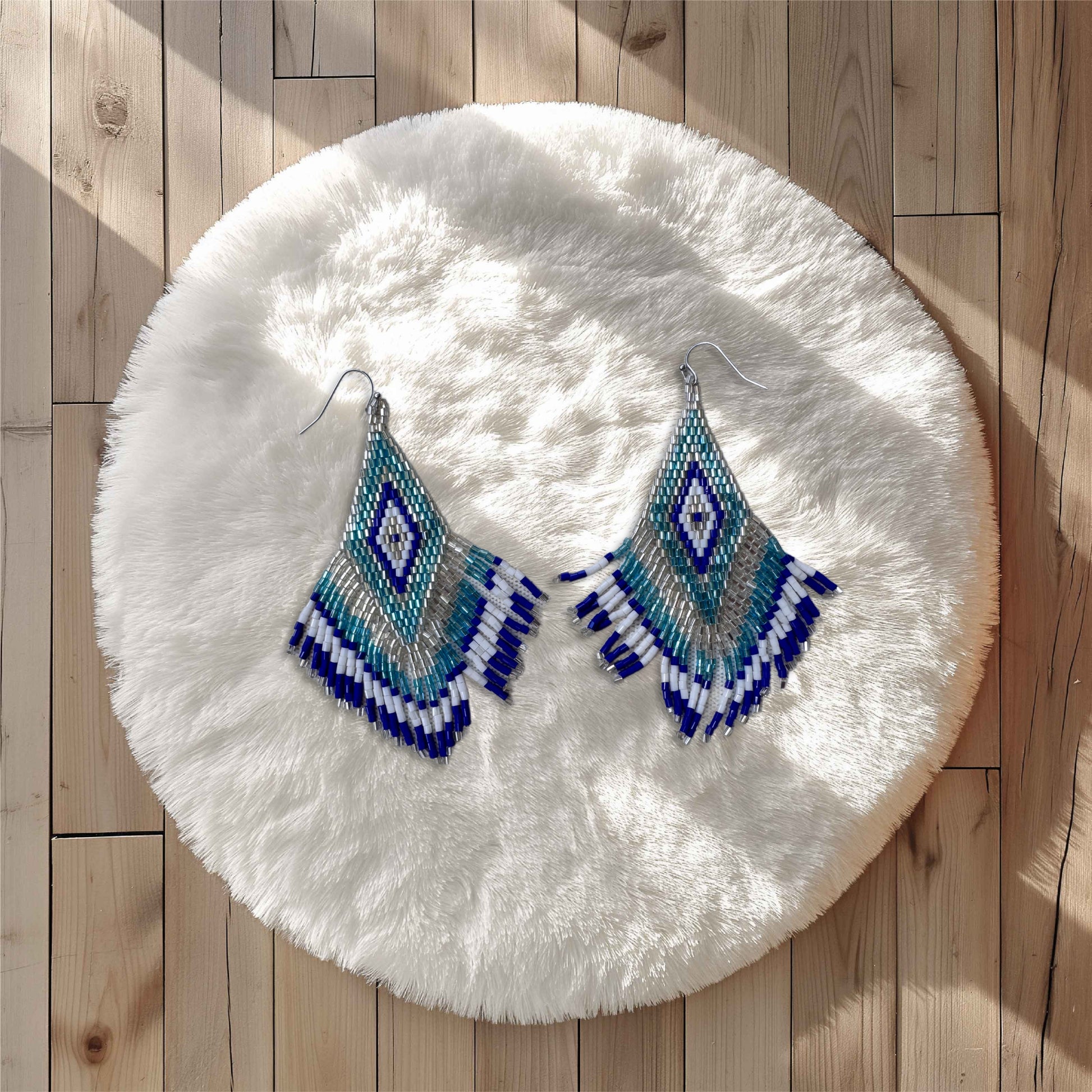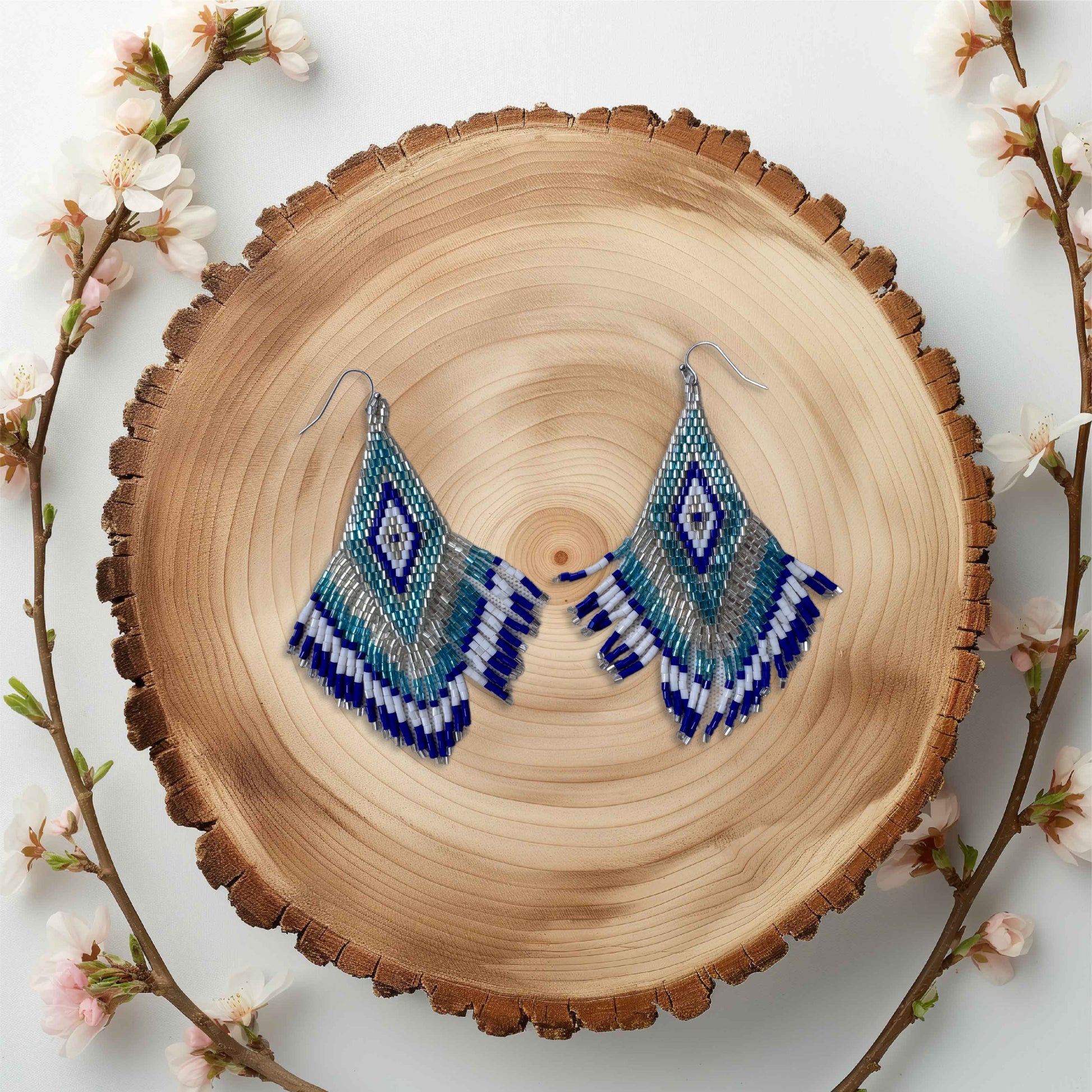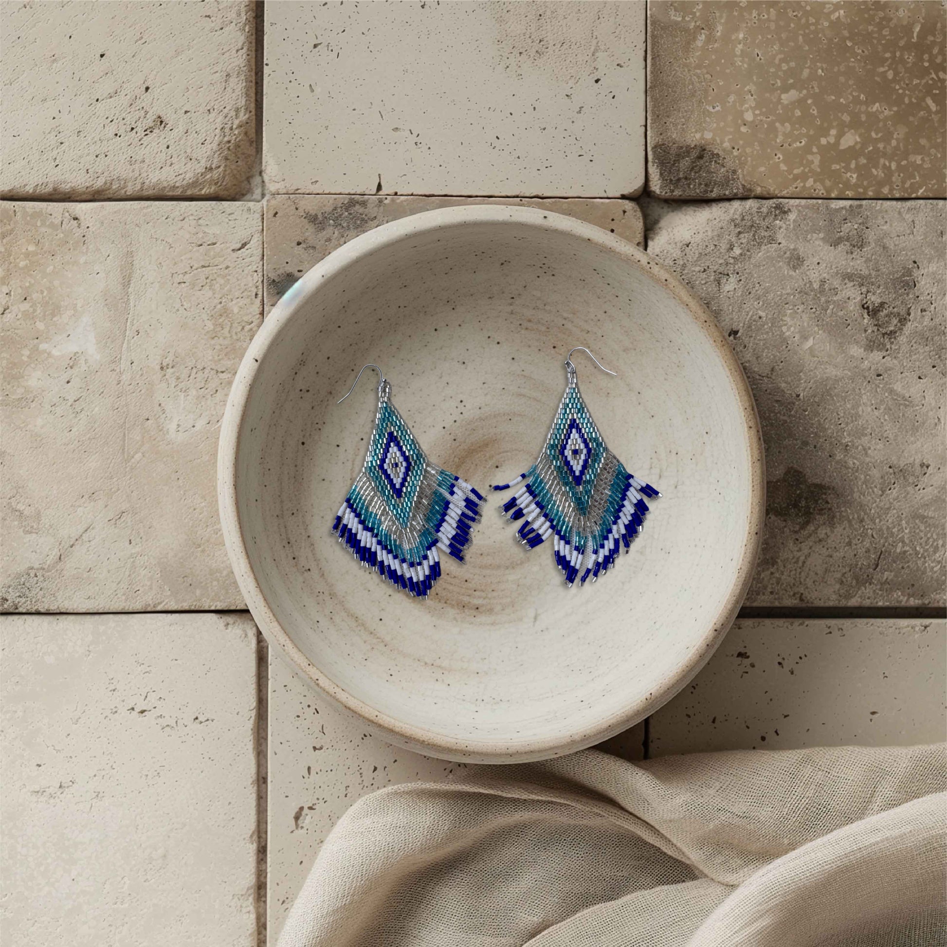 coastal earrings, beaded earrings, handmade jewelry, fringe earrings, silver and blue earrings, seed bead earrings, boho statement earrings, lightweight dangle earrings, ocean-inspired jewelry, artisan beaded earrings, slow fashion accessories, beachy earrings