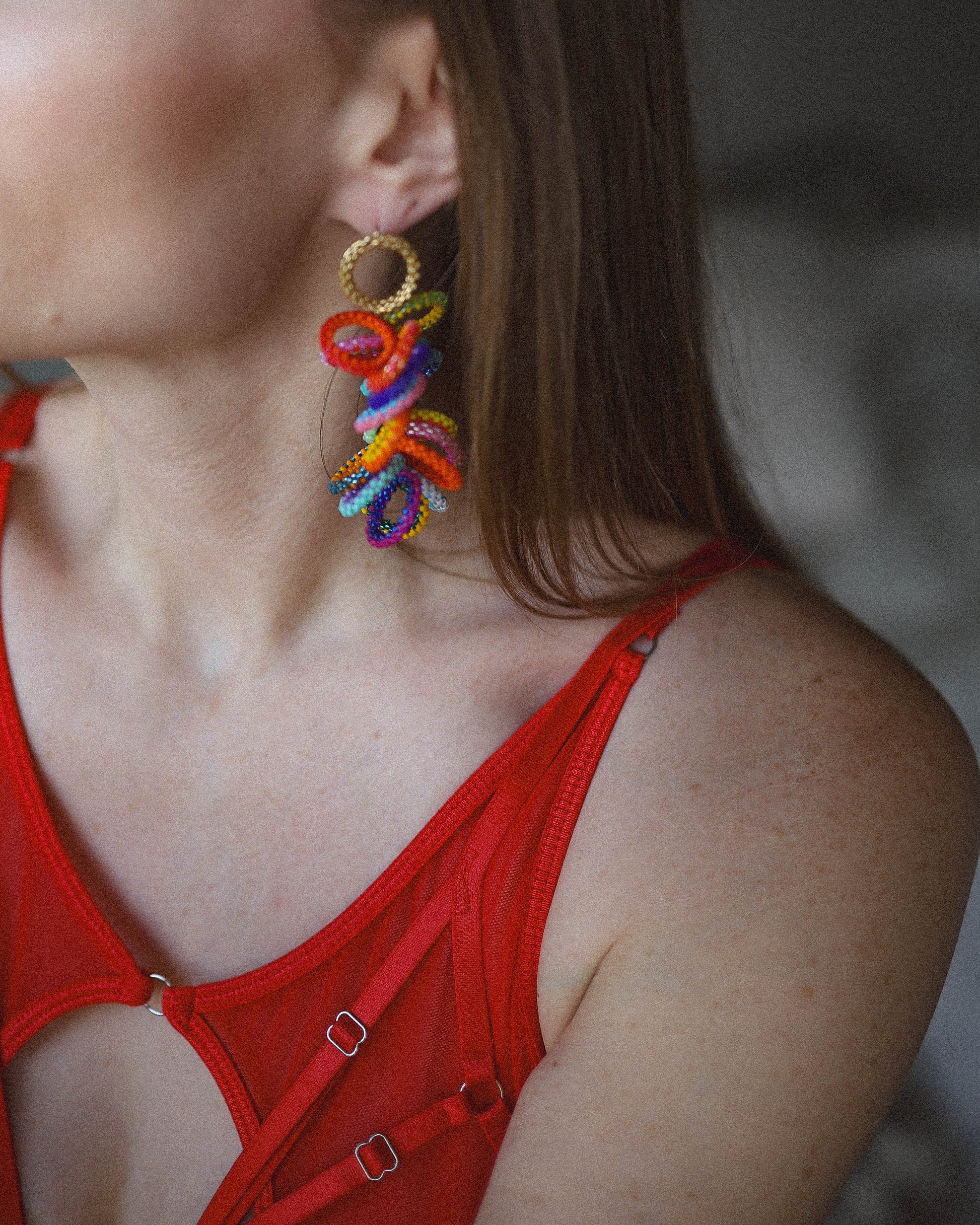 Bold, vibrant, and full of movement, these statement earrings from the Pride Collection are a celebration of individuality and joy. Each earring is meticulously handwoven using high-quality Miyuki seed beads, creating intricate loops in a full spectrum of rainbow colors. The playful design dances with every movement, making these earrings a true standout piece.